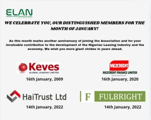 As this month marks another anniversary of joining the Association and for your invaluable contribution to the development of the Nigerian leasing industry and the economy. We wish you more giant strides in years ahead